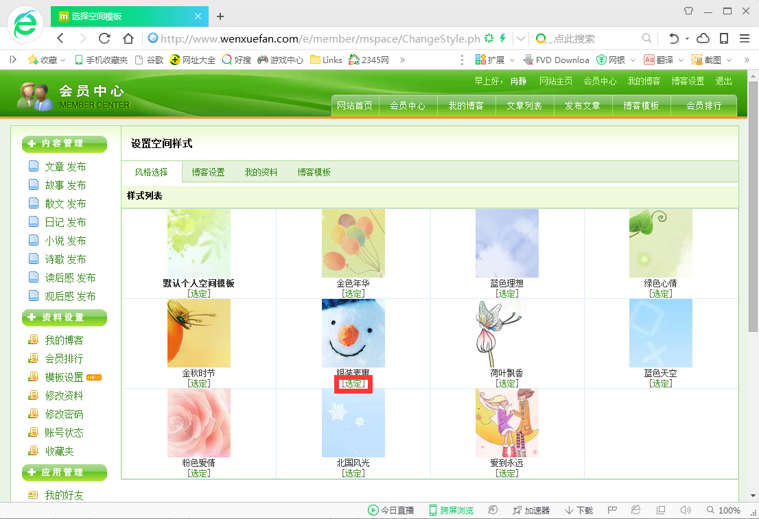 选择喜欢的模板,点击“选定”,然后进入自己的个人主页,刷新,就可以看到效果了。